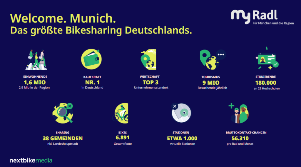 In spring 2026, MyRadl will launch as a new regional bike-sharing system for Munich and the entire MVV transport network area. nextbike will provide a fleet of around 6,800 bicycles (including e-bikes) at nearly 1,000 locations. 5,200 of these bikes can carry advertising. Bike sharing closes the gap between public transport, workplaces, appointments, and residential areas. MyRadl delivers this “last mile” solution across the region, with a network connecting the city and its surrounding areas.